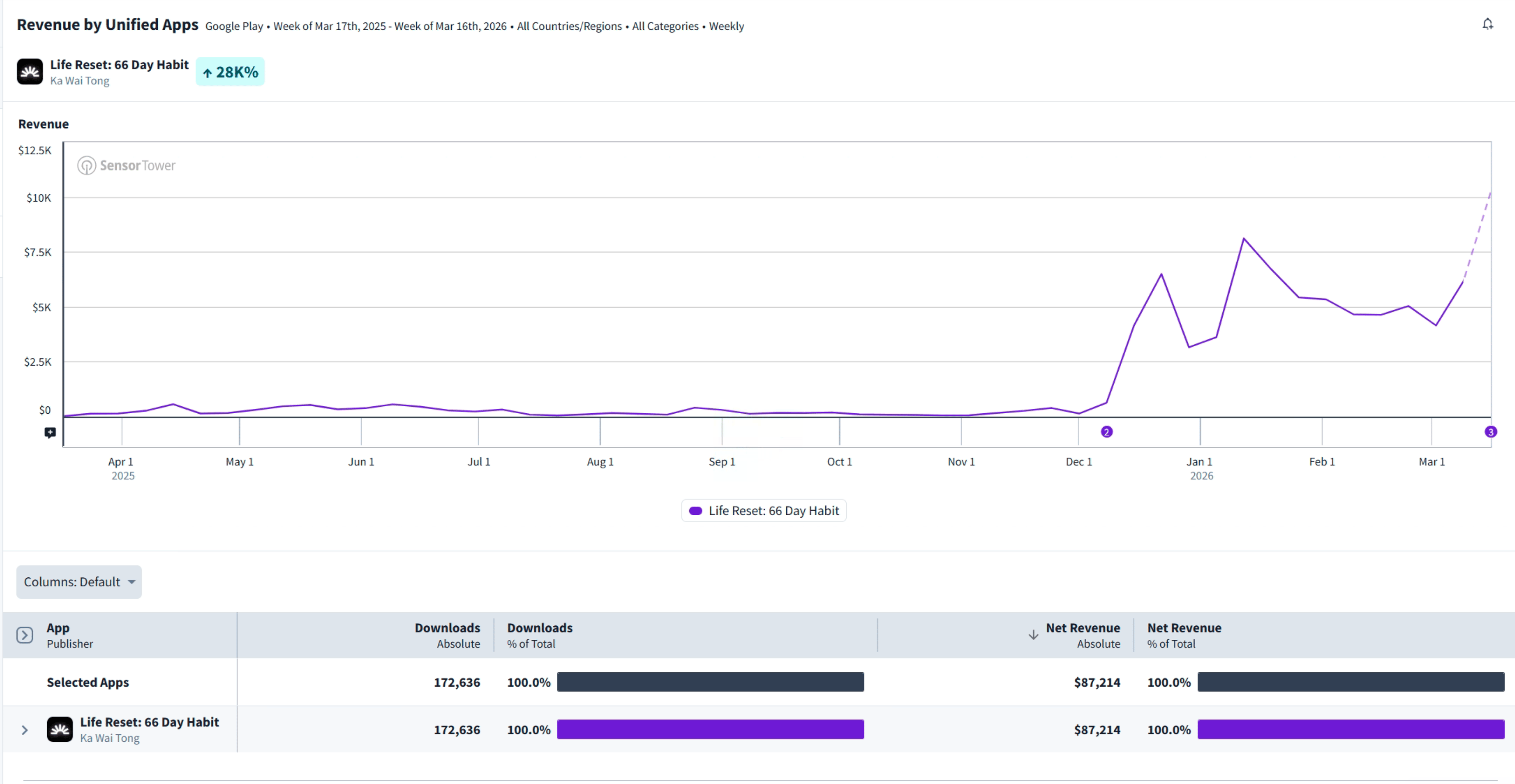 Peak was in August 2025 at nearly $90K/week. Since then – a steady decline. Current revenue over the last 30 days: ~$7K.