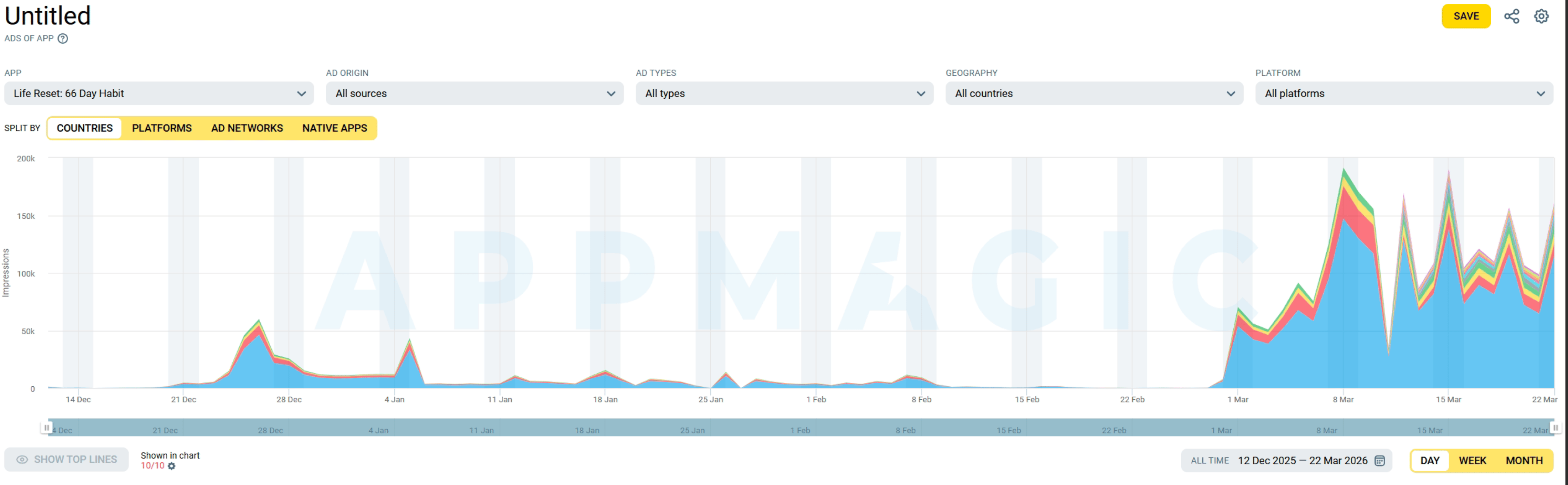 Good news: they're back. In March alone, they launched 51 new creatives – matching their October/November pace. Active ads jumped from 40 to 120 in one week.